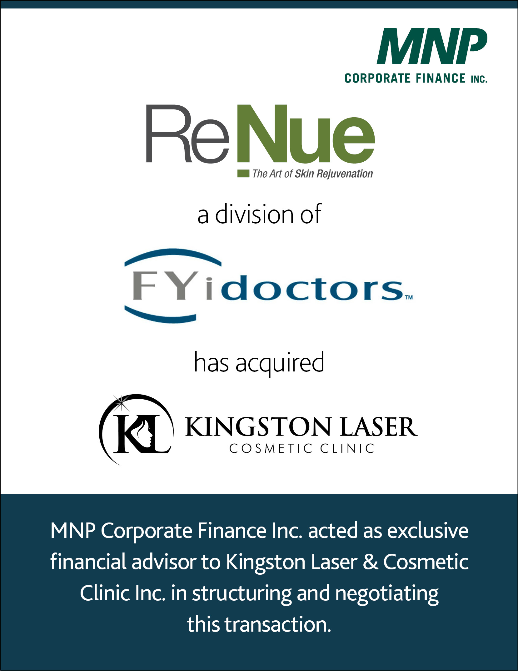 ReNue, a division of FYidoctors, has acquired Kingston Laser & Cosmetic Clinic Inc. MNP Corporate Finance Inc. acted as exclusive financial advisor to Kingston Laser & Cosmetic Clinic Inc. in structuring and negotiating this transaction.