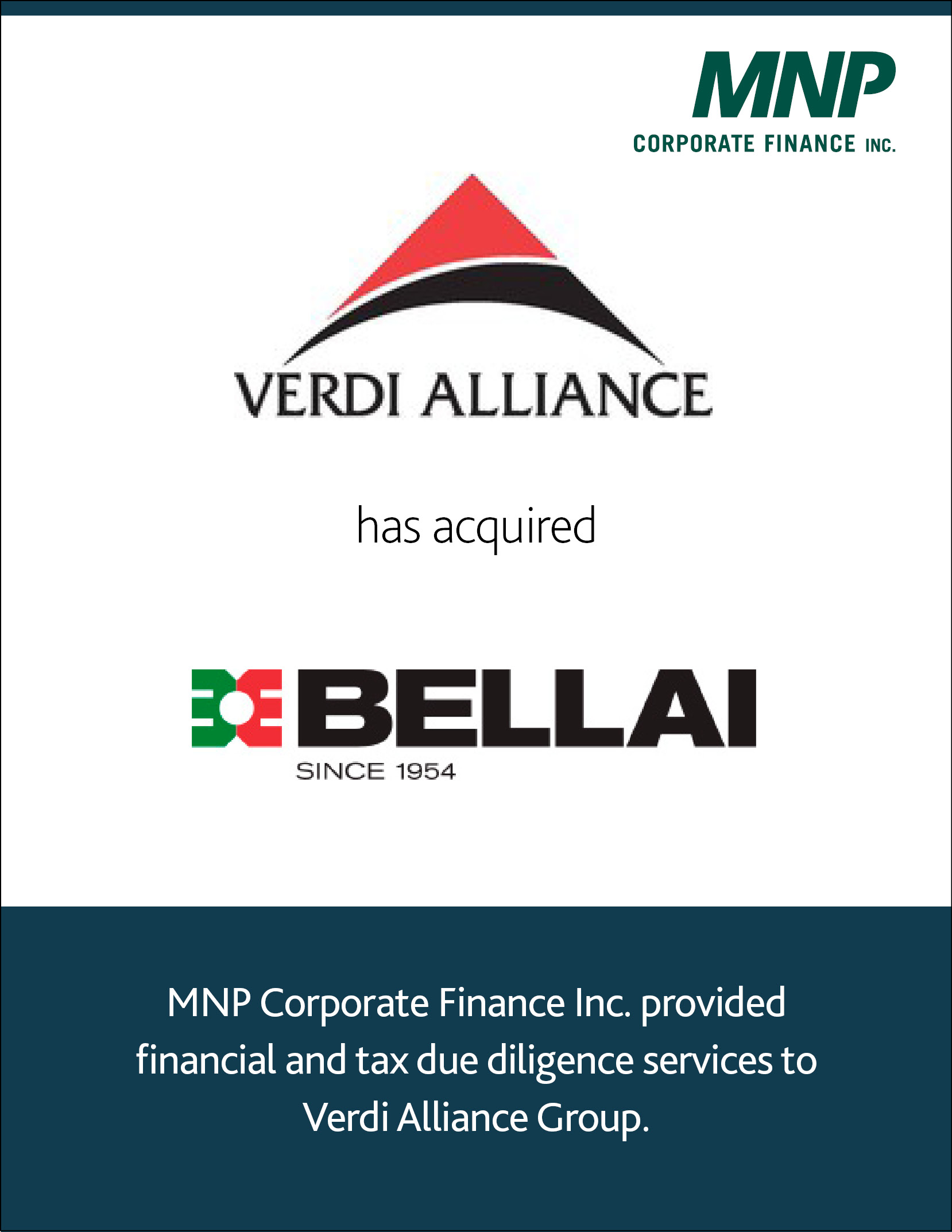 Verdi Alliance Group has acquired Bellai Groupe Ltd. MNP Corporate Finance Inc. provided financial and tax due diligence services to Verdi Alliance Group.