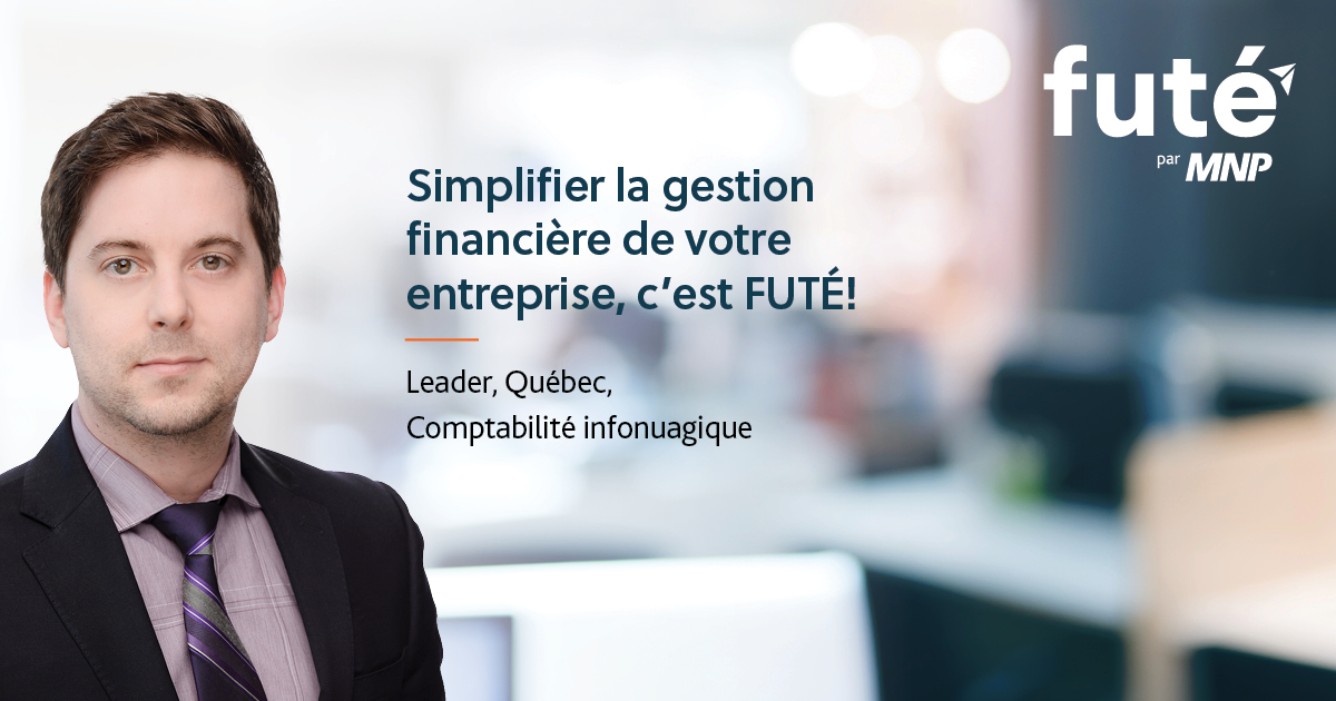 Je suis le leader du service FUTÉ pour le Québec. FUTÉ, c’est la solution de comptabilité infonuagique de MNP. Je suis également associé au sein de notre équipe de certification et de comptabilité. Je suis appelé à porter plusieurs chapeaux, qu’il s’agisse d’aider les organisations à sous-traiter leur comptabilité et à trouver le logiciel qui convient à leurs besoins ou de préparer des états financiers et de conseiller mes clients sur des questions de nature commerciale, fiscale ou structurelle.