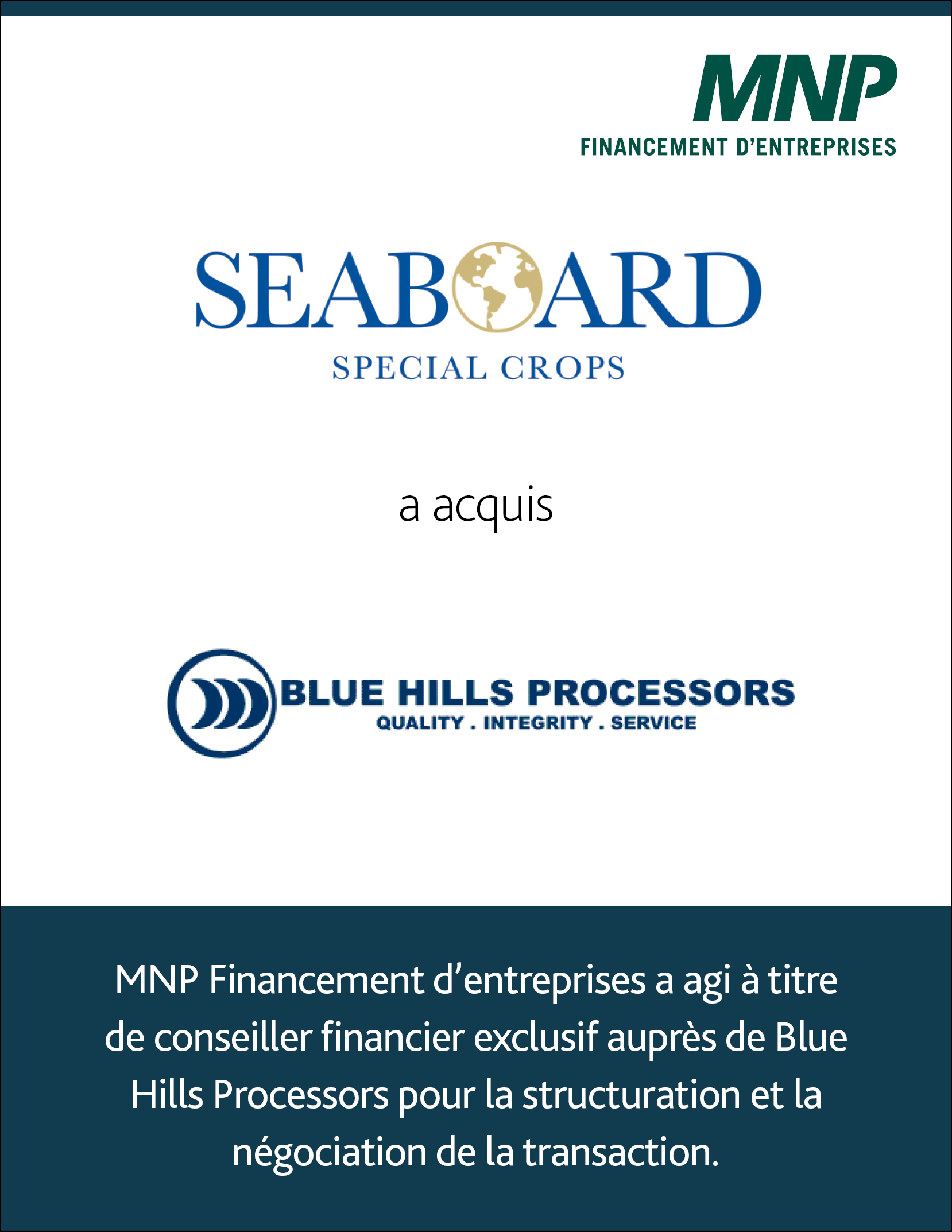 Seaboard Special Cropsa acquis Blue Hills Processors. MNP Financement d'entreprises a agi à titre de conseiller financier exclusif auprès de Blue Hills Processors pour la structuration et la négociation de la transaction.