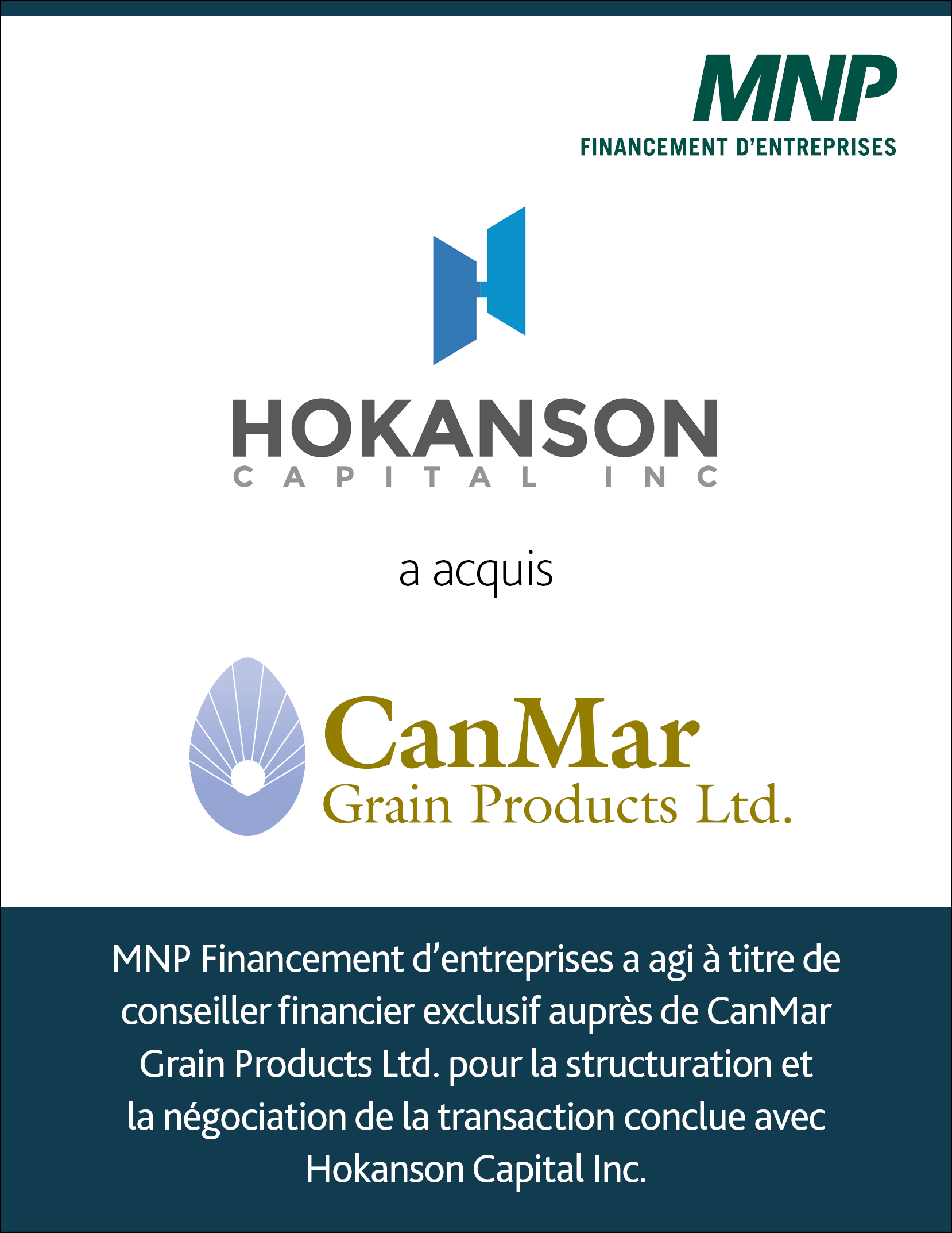Hokanson Capital Inc. a acquis CanMar Grain Products Ltd. MNP Financement d'entreprises a agi à titre de conseiller financier exclusif de CanMar Grain Products Ltd. pour la structuration et la négociation de la transaction.