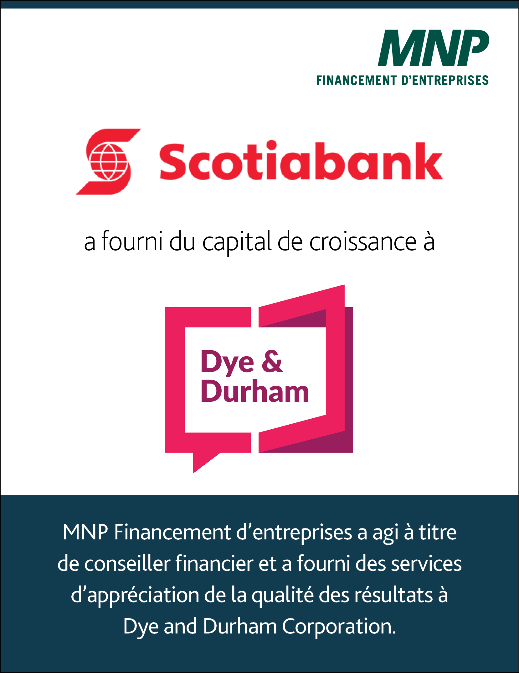 La Banque Scotia a fourni du capital de croissance à Dye and Durham Corporation. MNP Financement d'entreprises a agi à titre de conseiller financier et a fourni des services d'appréciation de la qualité des résultats à Dye and Durham Corporation.