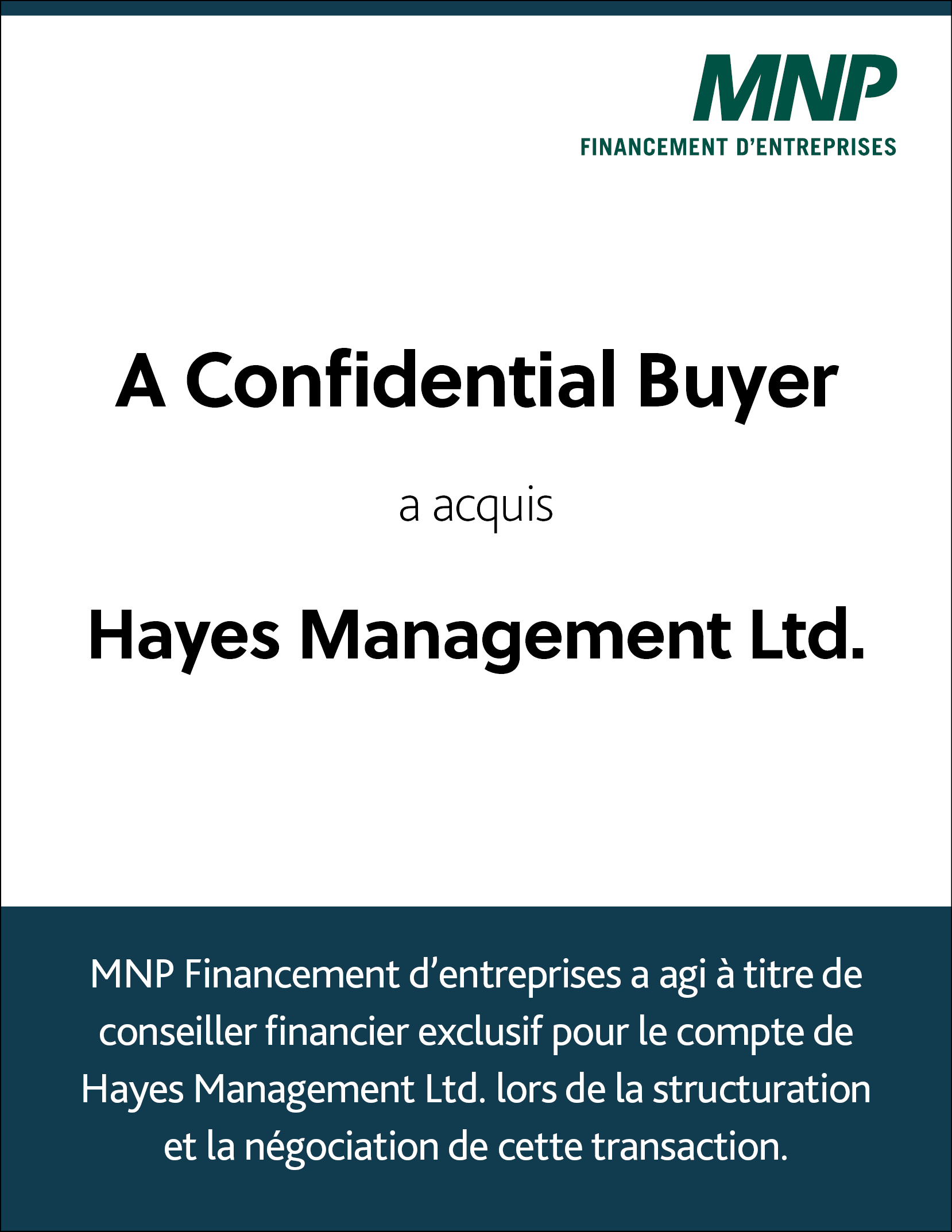 Un acheteur confidentiel a acquis Hayes Management Ltd. MNP Financement d'entreprise a agi à titre de conseiller financier exclusif pour le compte de Hayes Management Ltd. lors de la structuration et la négociation de cette transaction.