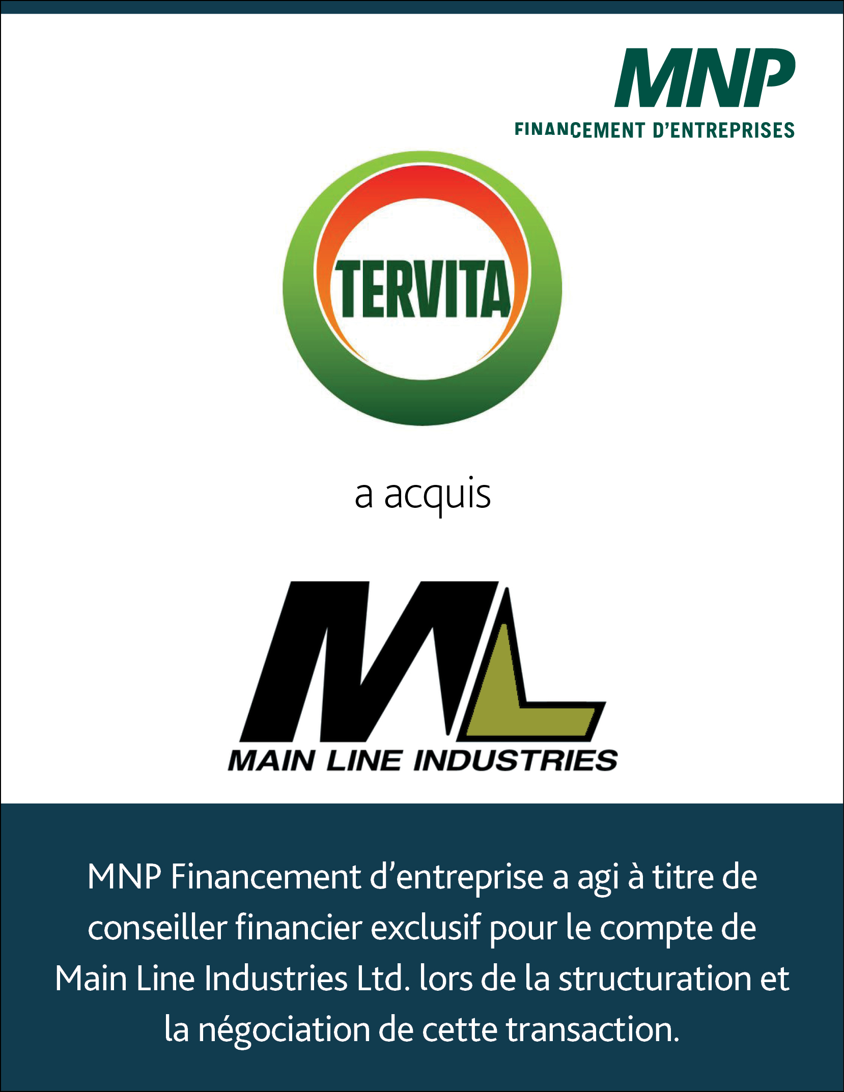Tervita Corporation a acquis Main Line Industries Ltd. MNP Financement d'entreprise a agi à titre de conseiller financier exclusif pour le compte de Main Line Industries Ltd. lors de la structuration et la négociation de cette transaction.