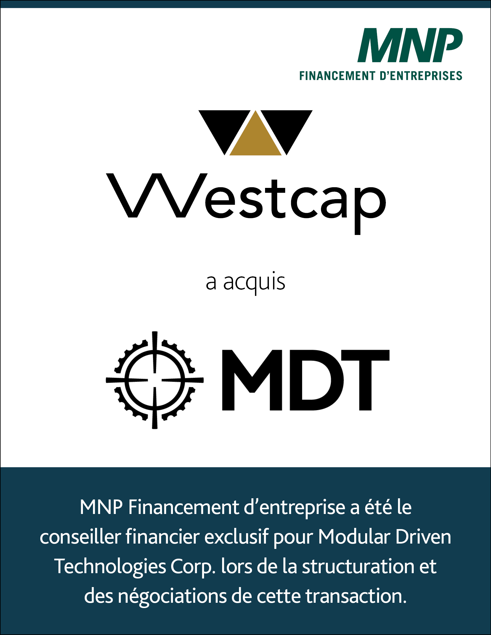 Westcap MBO Investment LP a acquit Modular Driven Technologies Corp. MNP Financement d'entreprise a été le conseiller financier exclusif pour Modular Driven Technologies Corp. lors de la structuration et des négociations de cette transaction.