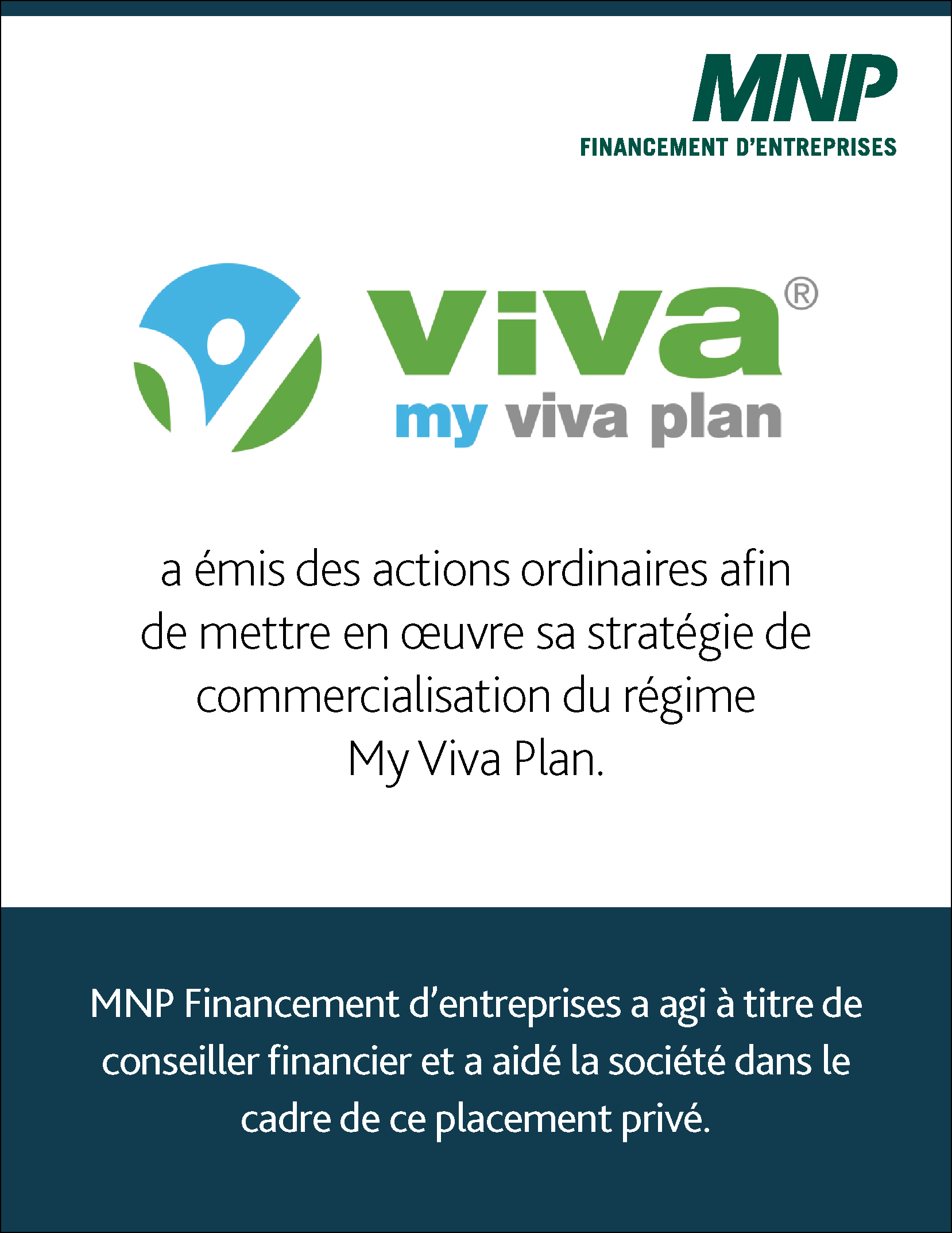 My Viva Inc. a émis des actions ordinaires afin de mettre en œuvre sa stratégie de commercialisation du régime My Viva Plan. MNP Financement d'entreprises a agi à titre de conseiller financier et a aidé la société dans le cadre de ce placement privé.