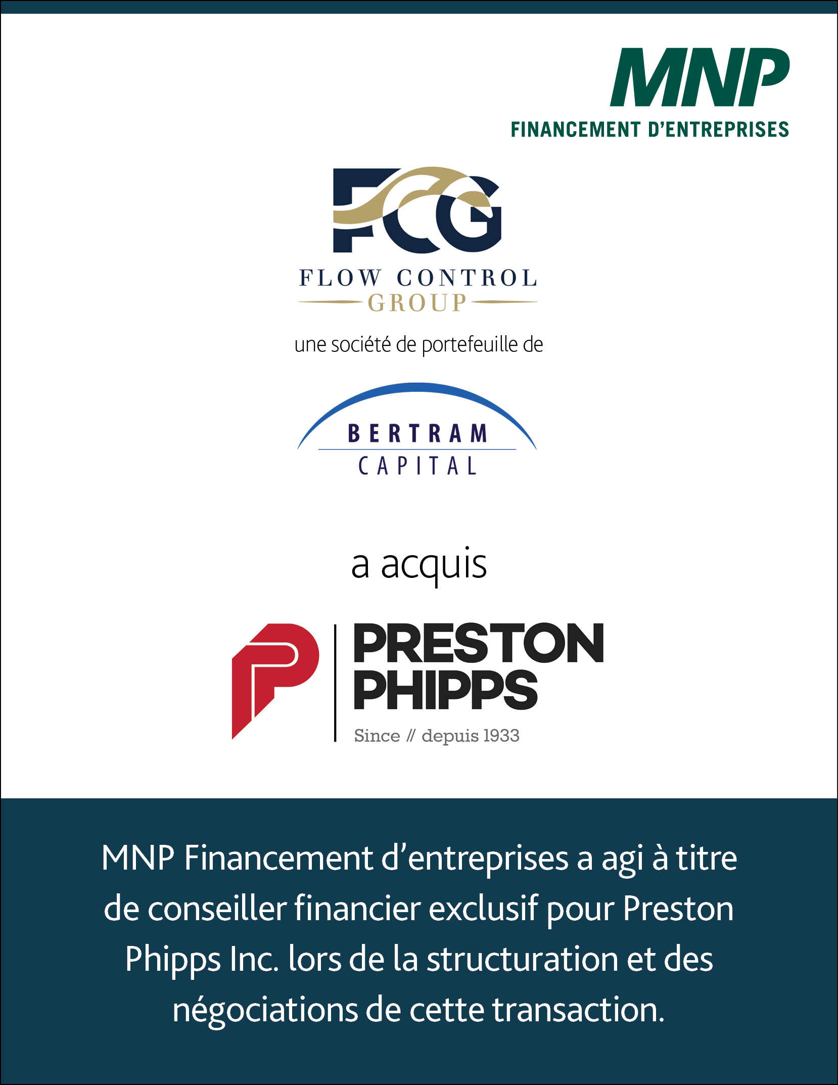 Flow Control Group, une société de portefeuille de Bertram Capital, a acquis Preston Phipps Inc. MNP Financement d’entreprise a agi à titre de conseiller financier exclusif pour Preston Phipps Inc. lors de la structuration et des négociations de cette transaction.