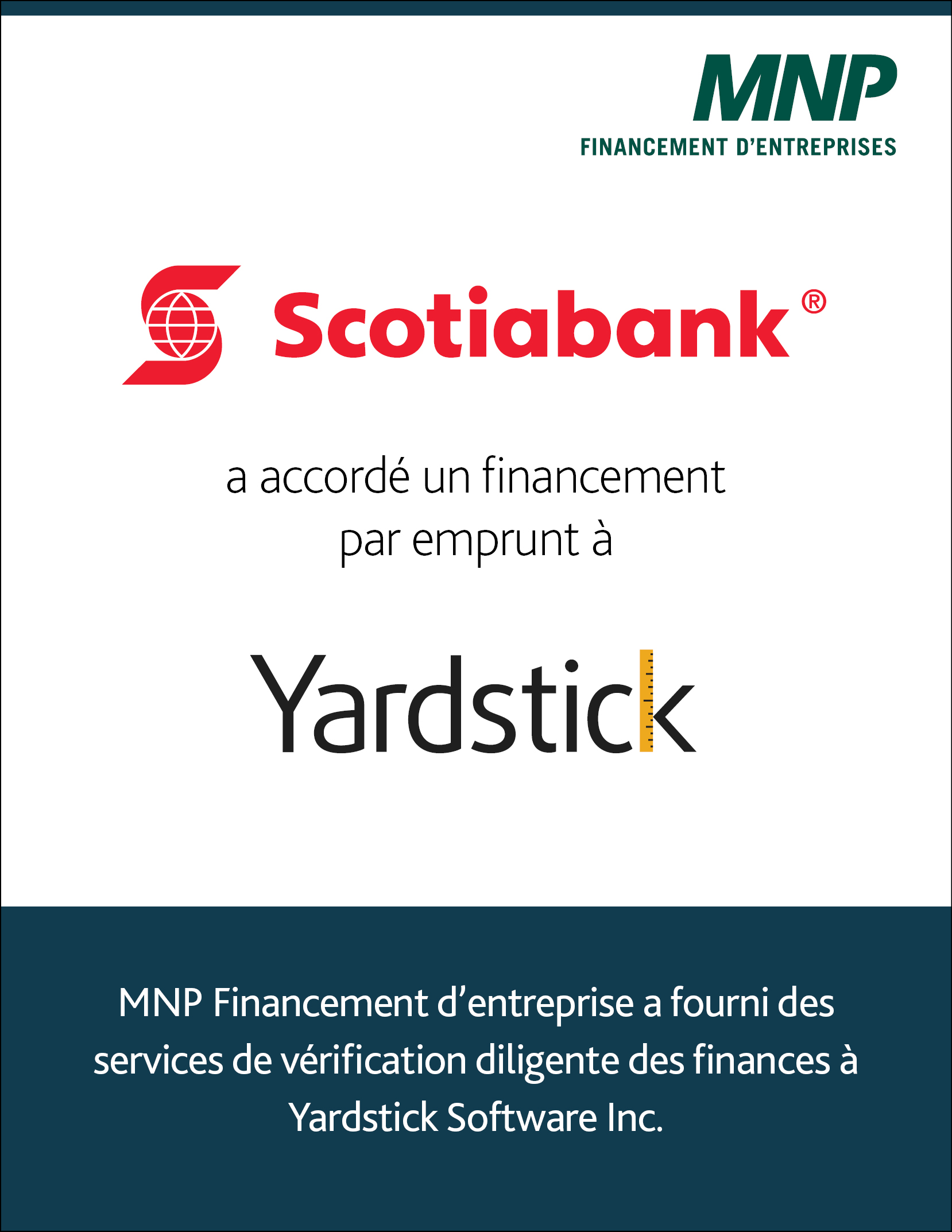 Banque Scotia a accordé un financement par emprunt à Yardstick Software Inc. MNP Financement d'entreprise a fourni des services de vérification diligente des finances à Yardstick Software Inc.