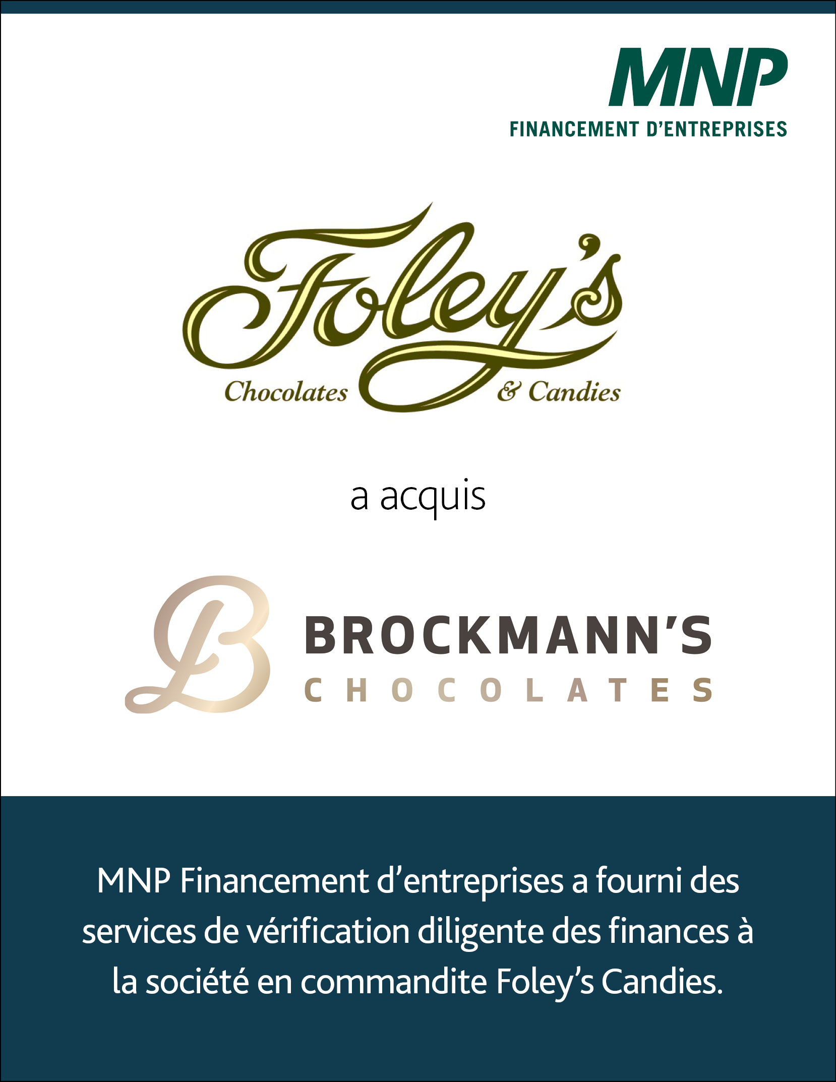 La société en commandite Foley's Candies a acquis Brockmann Chocolate Inc. MNP Financement dentreprise a fourni des services de vérification diligente des finances à la société en commandite Foley's Candies.