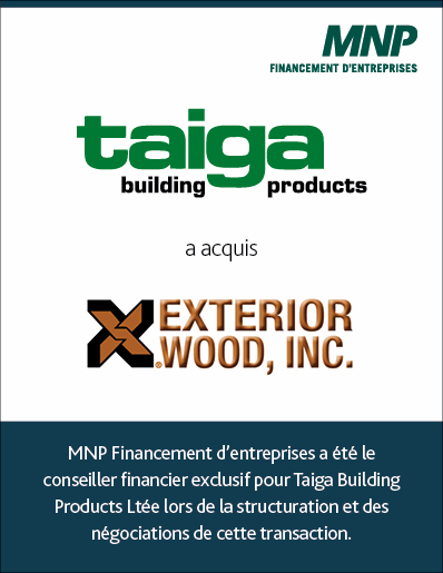 Taiga Building Products Ltée a acquis Exterior Wood, Inc. MNP Financement d'entreprise a été le conseiller financier exclusif pour Taiga Building ProductsLtée lors de la structuration et des négociations de cette transaction.