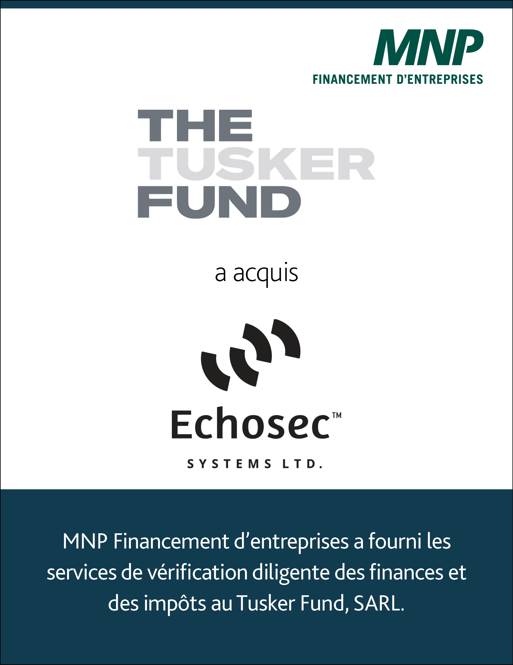 The Tusker Fund, SARL a acquis Echosec Systems Ltd. MNP Financement d’entreprise a fourni les services de vérification diligente des finances et des impôts au Tusker Fund, SARL.