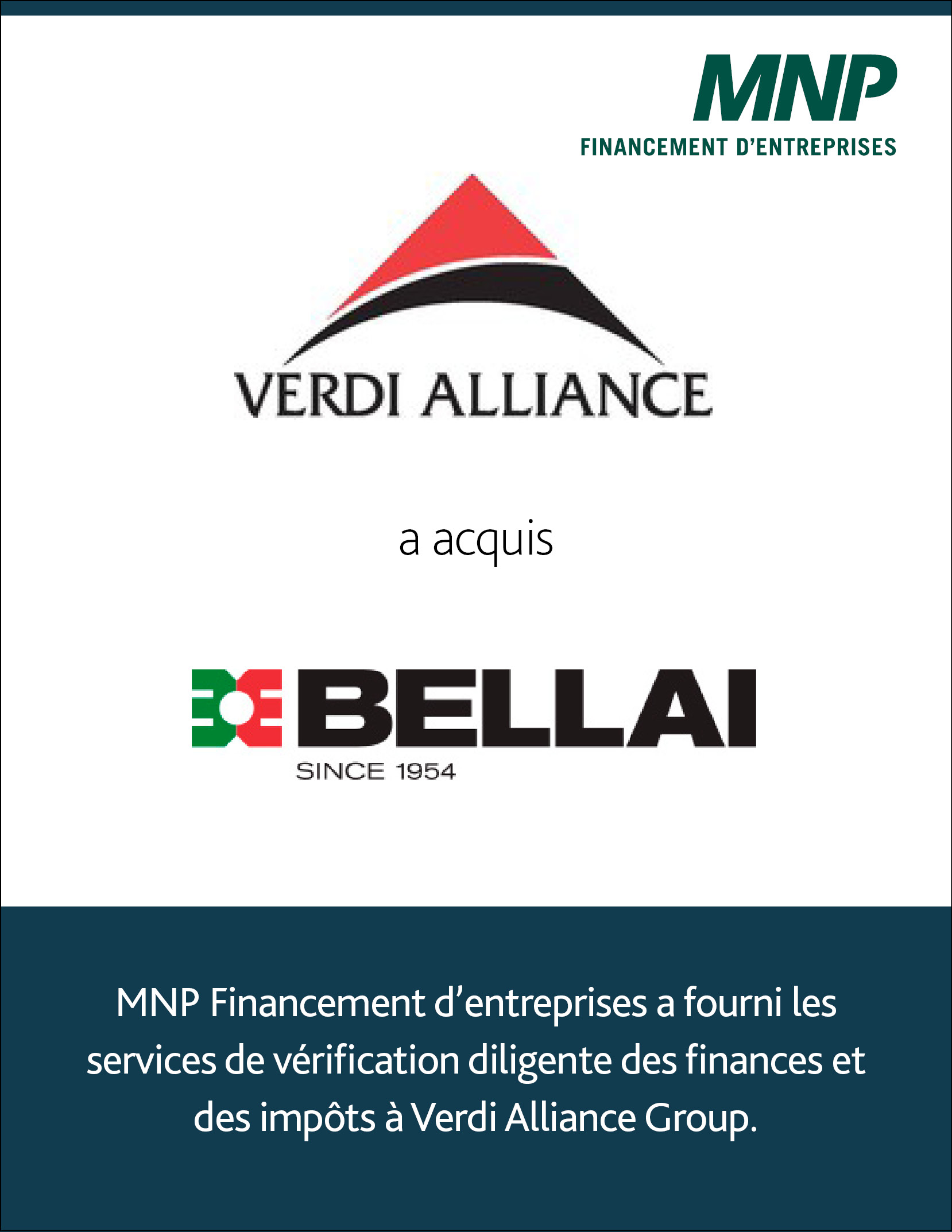 Verdi Alliance Group a acquis Bellai Groupe Ltd. MNP Financement d’entreprise a fourni les services de vérification diligente des finances et des impôts à Verdi Alliance Group.